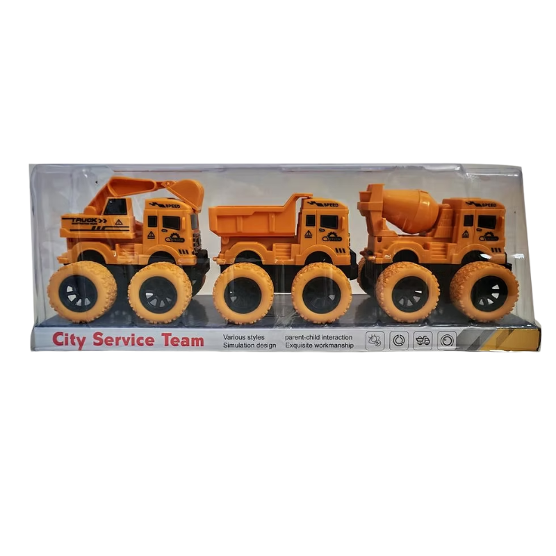 Set of three retractable construction vehicles including dump truck,crane and cement mixer