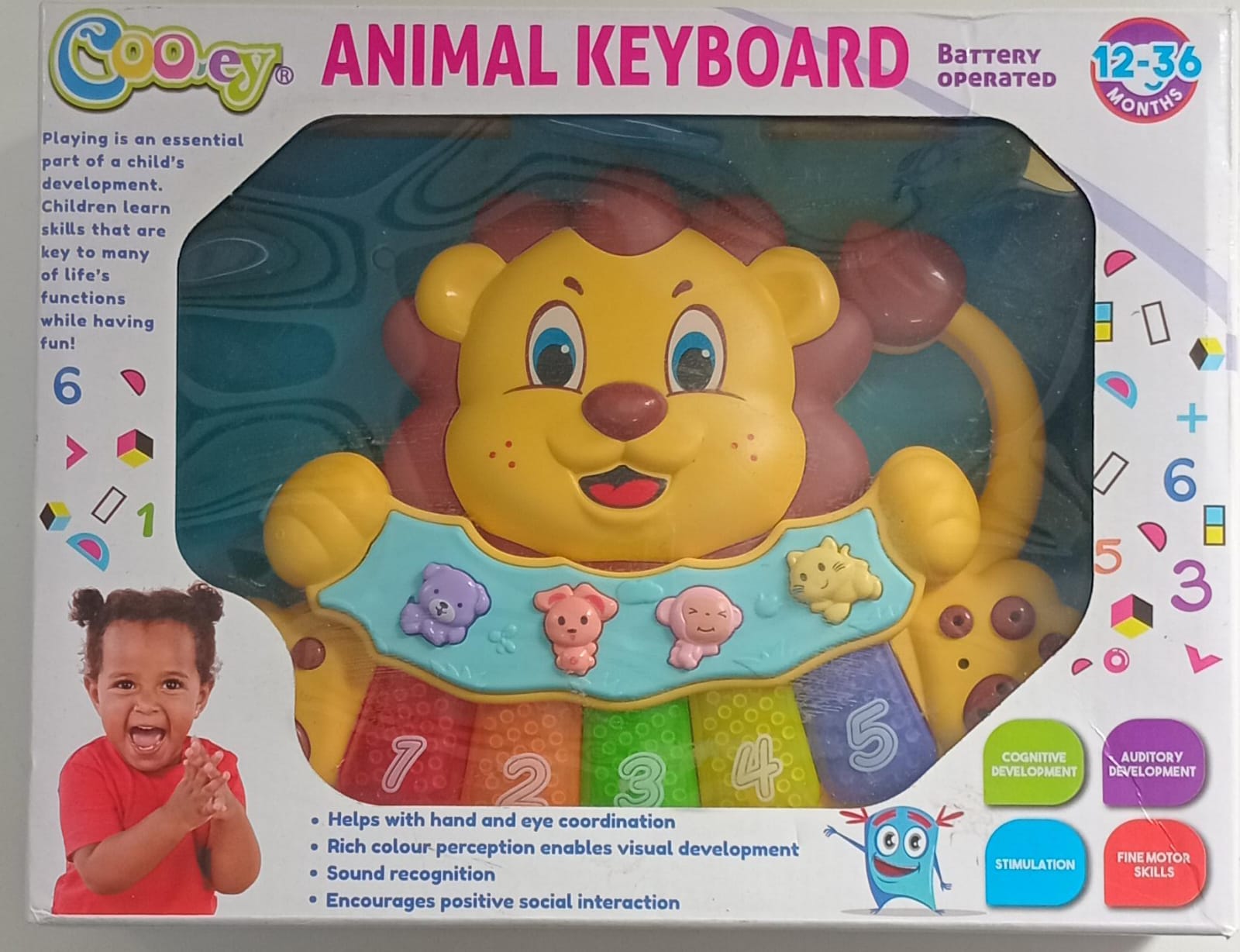 Battery operated lion shaped keyboard that lights up and makes sounds when the buttons are pressed.
