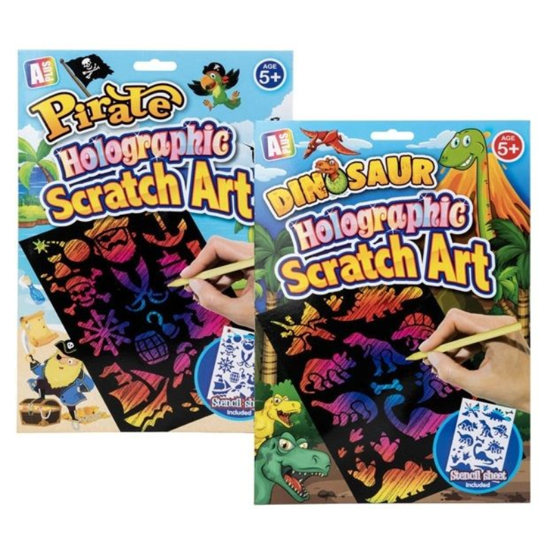 Two holographic scratch art sheets with assorted stencil sheet and wooden stick