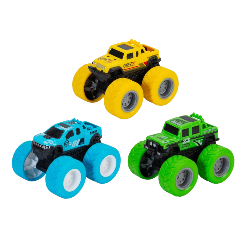 Assorted plastic monster truck with retractable rubber wheels. The top of the vehicle pops up when the bumper bumps into something.