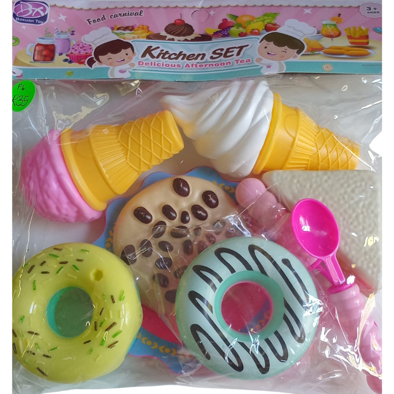 Plastic kitchen set including 2 ice creans, 2 donuts, 2 spoons, 2 plates, 1 cookie and 1 sandwich.