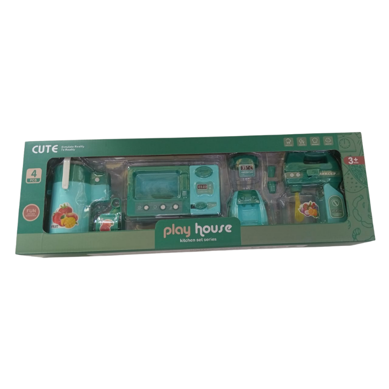 Set of four kitchen appliances including a blender, microwave, coffee machine and mixer