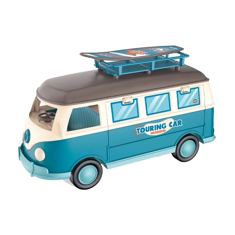 Plastic mini-bus with a surfboard and lights plus sound that go on with batteries